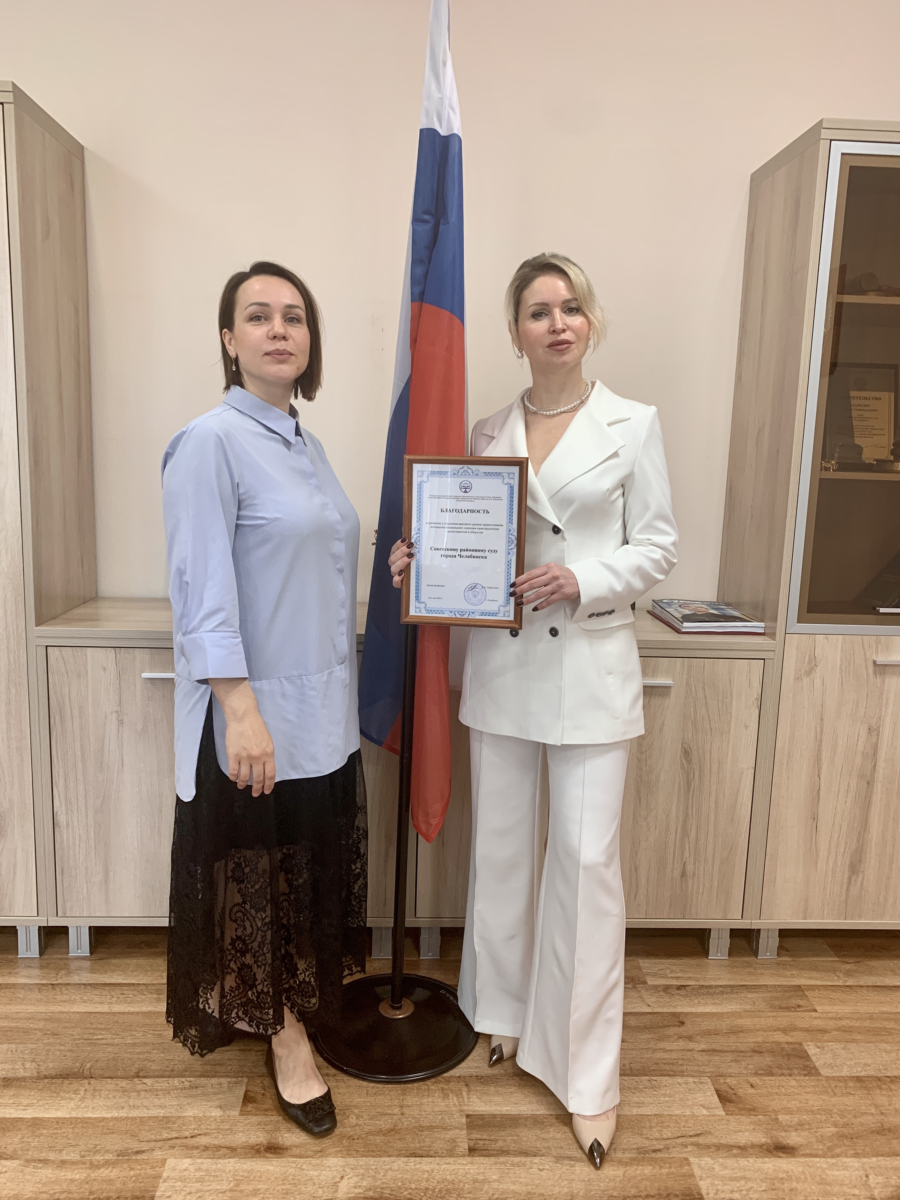 5 июня 2025 года в торжественной обстановке от лица директора УФ ФГБОУ ВО «Российский государственный университет правосудия имени В.М. Лебедева» Гарбатовича Д.А. коллектив Советского районного суда г.Челябинска получил благодарность за вклад в развитие у студентов уровня правосознания, понимания социального значения юриспруденции и роли юристов в обществе. В данном образовательном учреждении в рамках Федерального закона от 21 ноября 2011 года № 324-ФЗ «О бесплатной юридической помощи в Российской Федерации» создана юридическая клиника. Студенты данного ВУЗа оказывают бесплатную юридическую помощь социально-незащищенным категориям граждан (инвалидам, пенсионерам, детям-сиротам, малоимущим, безработным), в связи с этим посещение судебных процессов для учащихся является огромным опытом. Отдельные благодарственные письма от заведующей отделением юридической клиники Кутеповой Т.О. за активное взаимодействие со студентами в данном направлении получили судьи Хабина И.С., Щеркина Т.Р., Шмелева А.Н., Губанова М.В. В завершении мероприятия председатель суда Маркова И.Г. поблагодарила коллектив УФ ФГБОУ ВО «Российский государственный университет правосудия имени В.М. Лебедева» за сотрудничество.